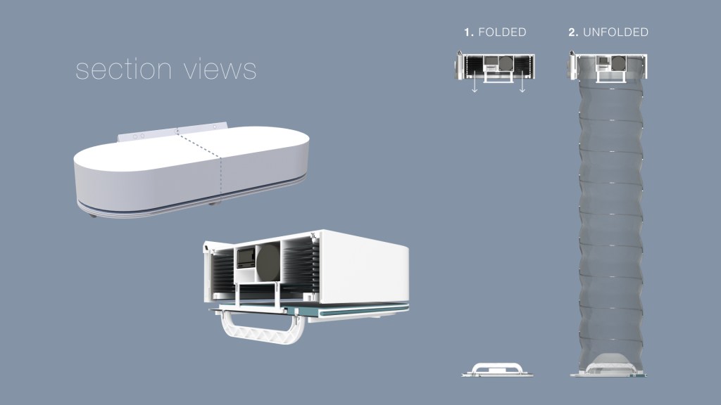 PP was also chosen for coherence. Indeed, the material selected to manifacture the foldable shell is a particular type of polypropylene called XPP which has great features such as gas resistance and compression rate. This makes Aeriform mostly monomateric, with the exception of standard components and wall attachment, and easily recyclable.