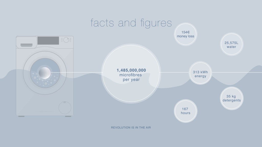 It has been discovered that 9 million microfibers are released into the environment every 6 kilos loads. This means that every year we are guilty of freeing almost one thousand five hundred million microfibers in the oceans. How might we reduce the use of traditional washing machines in order to release less micro-plastics? How might we change in better the way laundry activities are performed? These questions guided the development of the product.