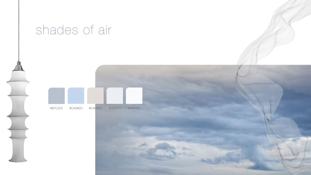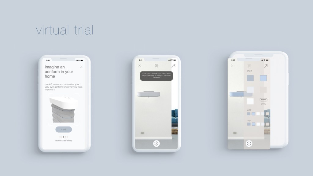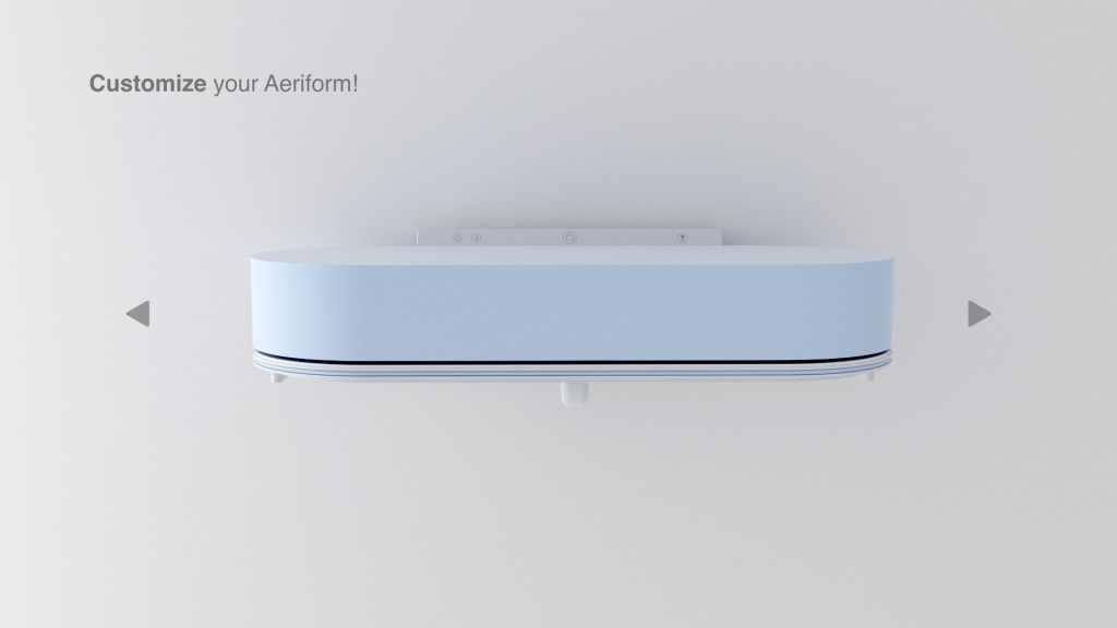 Aeriform is a versatile product. Its unrecognizable shape could fit in any kind of environment. It is available in different colors and finishings in line with its brand identity. The color palette takes inspiration from the multiple shades of air and they are provided with both matte or shiny finishing, as shown in the next page. The outer case and the cable, which always visible, can be customized through the app.