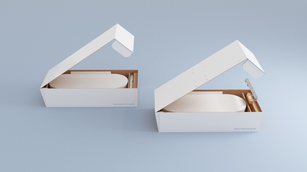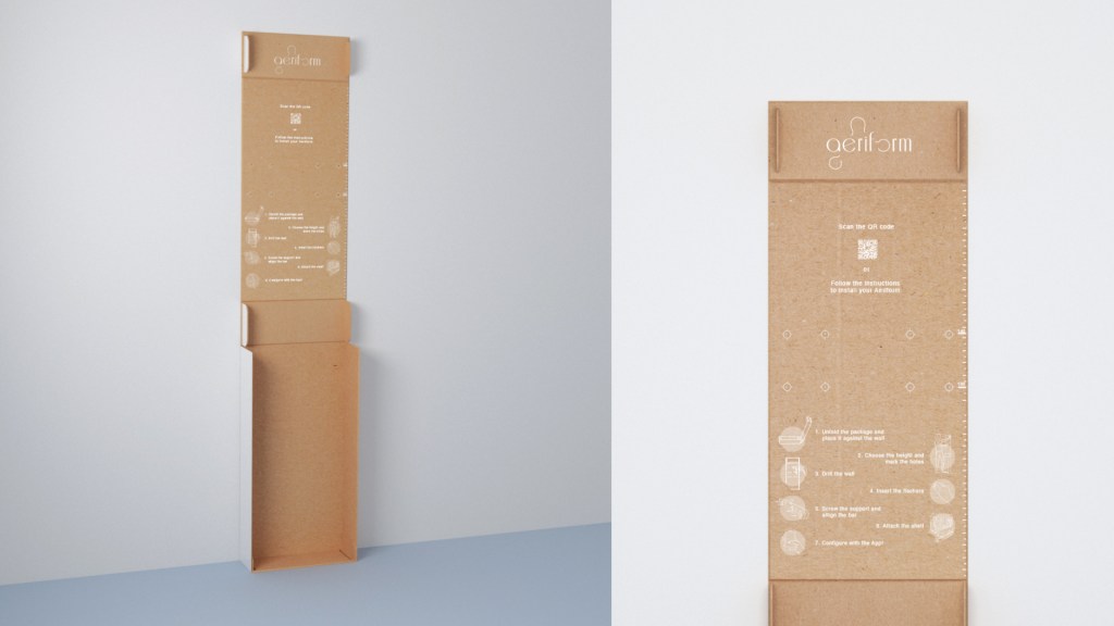 Aeriform is delivered home in its original packaging designed to be useful to the user during the installation phase. Inside the packaging the user will find the assembled product, the wall attachment bar and a small box containing the screws and fishers necessary to hang the product on the wall. On the inner side of the package the instructions to install Aeriform are printed. This allows to minimize paper waste and fully exploit the box. The packaging, once opened, shows also the double possible height: the user can decide wether to install Aeriform at 1,40 m or 1,30.