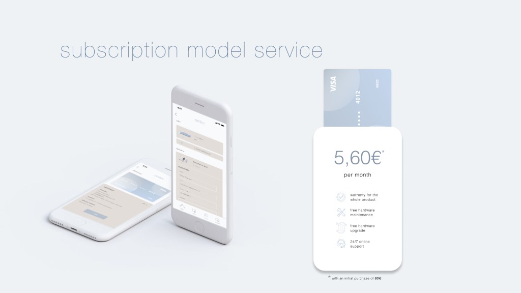 Aeriform’s service is subscription based. With an initial purchase of 60 euros the customer buys the analogic product (without the electronic components and hardware). Then by paying a monthly fee he can lease the hardware with all the components that are needed to make Aeriform work. This kind of subscription model on the one hand ensures a continuous income for the start-up that in this way has the possibility to pay all the backstage staff and technicians and on the other hand guarantees maintenance and support to the users during the whole product lifecycle. The leasing model also allows to drastically reduce the price of the whole device. Indeed, the first year the user will pay less than 130 euros to have an Aeriform and from the second year on the only expense required will be the one needed to pay the lease, which will be less than 70 euros for the whole year.