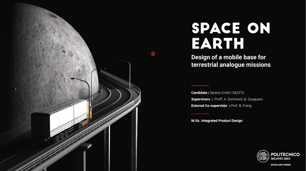 Multiverso Hab is a transportable habitat designed to conduct simulations of Space missions on Earth with ground-based teams of astronauts. These missions are called “analogue missions”. The project is therefore set in the context of Design for Space. The overall goal of design in this field is providing well-being to astronauts in the extreme and confined environment of Space modules. The project was developed under the academic supervision of professors Annalisa Dominoni and Benedetto Quaquaro (founders of the course Space4InspirAction at Polimi in collab with the European Space Agency) and Professor Bernard Foing (former ESA scientist, Principal Project Scientist for SMART-1 – the first European mission to the Moon, and also executive director of the International Lunar Exploration Working Group and EuroMoonMars). This project was conceived for the EuroMoonMars organisation, which for many years has been involved in organising Earth analogue missions in various locations around the world. It was an individual project.