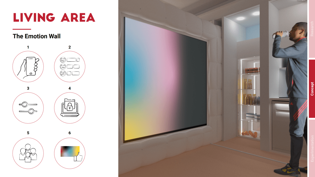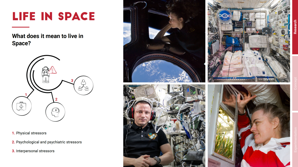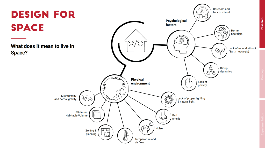 An in-depth analysis of the typical stressors of spacecraft environments was conducted, with the user-astronaut at the centre, in order to identify design opportunities and thematic areas to be addressed in the design of the habitation unit for simulations.