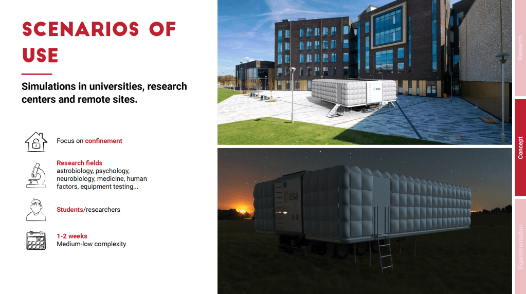 The habitat can be used either to conduct simulations within university hubs and research centres that require it, or in remote areas. The systems are optimised to make it autonomous for conducting simulations lasting up to 2 weeks, for 4 students/researchers. The second scenario is that of outreach. In this case, Multiverso Hab becomes a proper itinerant museum open to the public that wants to learn about the living conditions on board a space base.