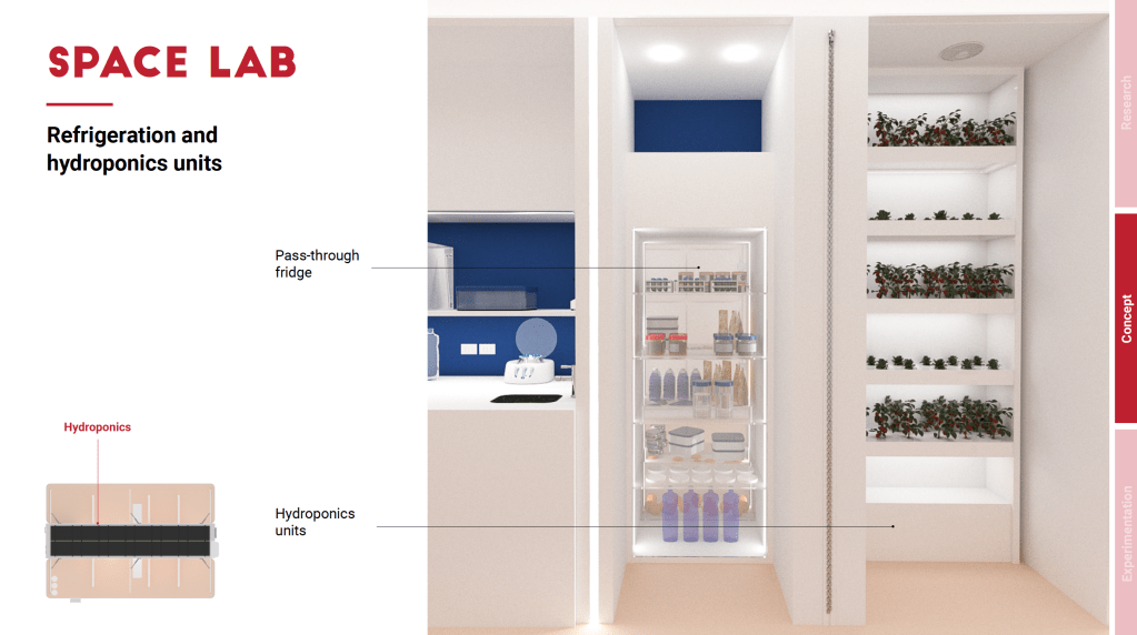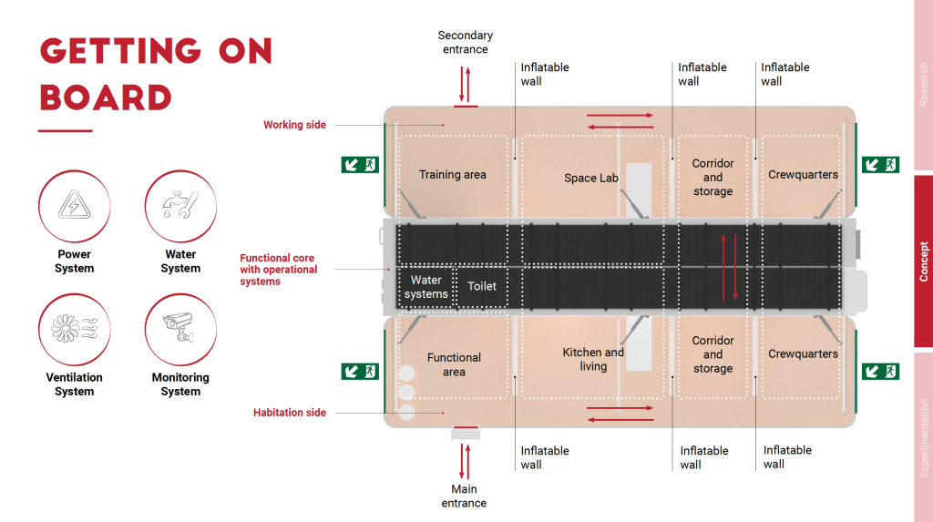 In the layout, the habitat is conceptually organised in three zones. In the centre is the functional core with the operating systems, optimised to allow autonomy for four people for a fortnight: electricity, water, ventilation and surveillance. Each of the main systems was envisaged on board at the concept level, thanks to consultancy with construction engineering firm AGM, which is based in Bergamo (Italy). The main components of the systems were also sized and located on board, with reference to commercially existing ones. On either side of the central unit are the living side, which is dedicated to the daily activities of the crew, and the working side, which is dedicated to the laboratory for conducting experiments on board. The final configuration is the result of in-depth reflections on zoning, aimed at meeting privacy requirements and improving life in the confined environment.
