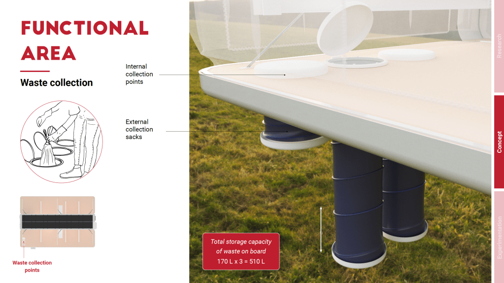 Thanks to a system of inflatable walls integrated into the central module, it is possible to divide up the interior areas, thereby creating functional zones of greater intimacy and privacy, while also promoting acoustic insulation of the different rooms. In this way, both communal areas, open spaces, and individual spaces for various activities can be obtained in the confined environment. Following are the main functional areas that have been provided on board.