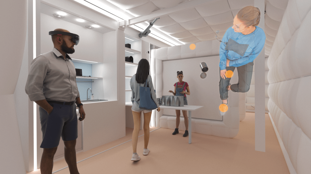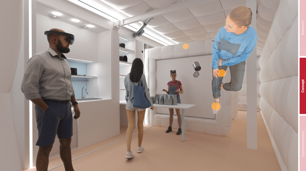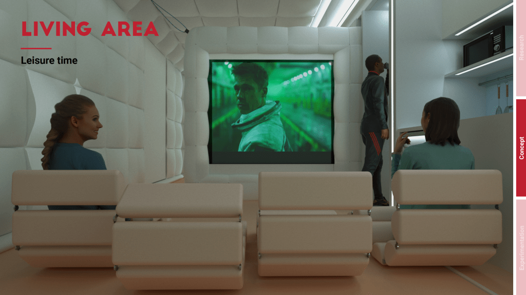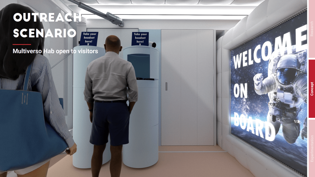 Multiverse Hab transforms into a unique experiential museum when it is opened to the public for outreach purposes. The internal distribution of zoning and inflatable divisions is designed to allow visitors to efficiently manage their internal path. While on board, they are invited to wear Microsoft Hololens visors as they tour through the various rooms of the Space base. Visors allow visitors to view realistic astronaut figures in microgravity in the different environments. These explain how daily activities, for example, the eating of meals, take place in a real space base. Visitors can then enjoy different experiences in the various rooms. In the kitchen, for example, they can taste space food, which is now commercialized by NASA for the Space enthusiasts.