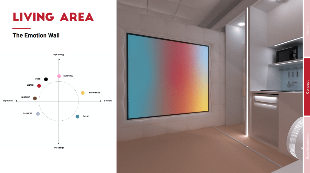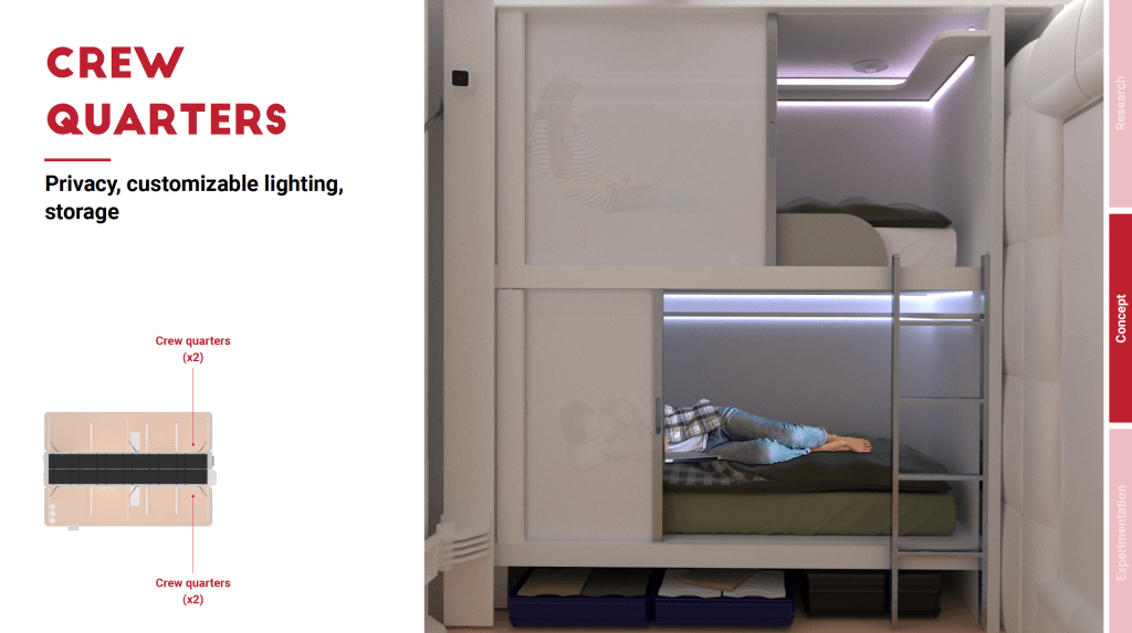 Here you can see the living side in its open-plan configuration. The colour palette was selected to create a pleasant and cosy environment; the colours are based on shades sampled from the natural world. The sky-blue hues applied to the vertical surfaces are intended to create the illusion of openings in the elevation, with the aim of reducing the sense of confinement. The decision was taken to refer to colours of the natural world, also known as “biophilic colours” (Kellert & Calabrese, 2015). Biophilic design reduces stress and enhances wellbeing (Browning et al., 2014). Biophilic colours are tones sampled from nature in different ways: extrapolated from the colour of the sky at different times of the day, from the tones of the sea, the ground or vegetation (Coulthard, 2020). Another important factor was the feeling of cosiness that was sought. In order to increase the sense of well-being, it was necessary that the crew did not feel immersed in an aseptic environment. This criterion, however, was accompanied by the need to create an environment that would also convey a “space-like” mood. The question was therefore: how can a feeling of intimacy be combined with the space imagery?