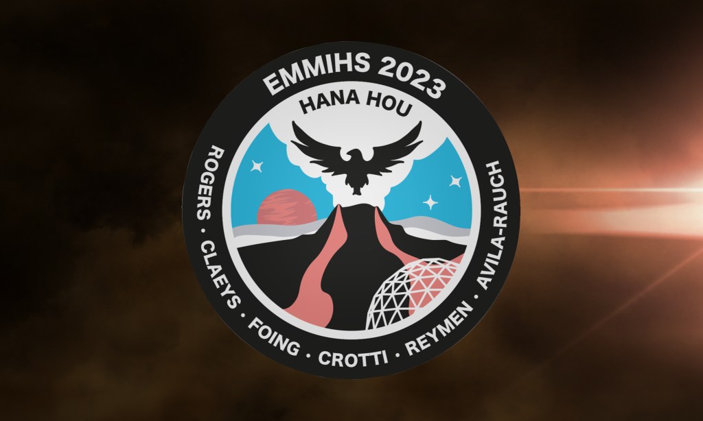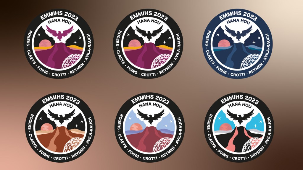 Hana Hou means “renaissance,” “to begin again” in Hawaiian. This name was chosen for the mission which took place last february on the Mauna Loa Vulcano because it was the first mission after several months of inactivity due to the volcanic eruptions of Mauna Loa. In the patch I decided to represent the silhouette of a phoenix, which among different cultures is a symbol of rebirth and new start. Also, the phoenix is reborn from the ashes, and it seemed like a good image given the recent lava eruptions of Mauna Loa. So, here are the various elements represented in the patch: the phoenix, the volcano, and in the background Mars. In the lower right corner I have included a schematic representation of the habitat, to put it in context. Several color variations were studied to then select the final one with the crew.